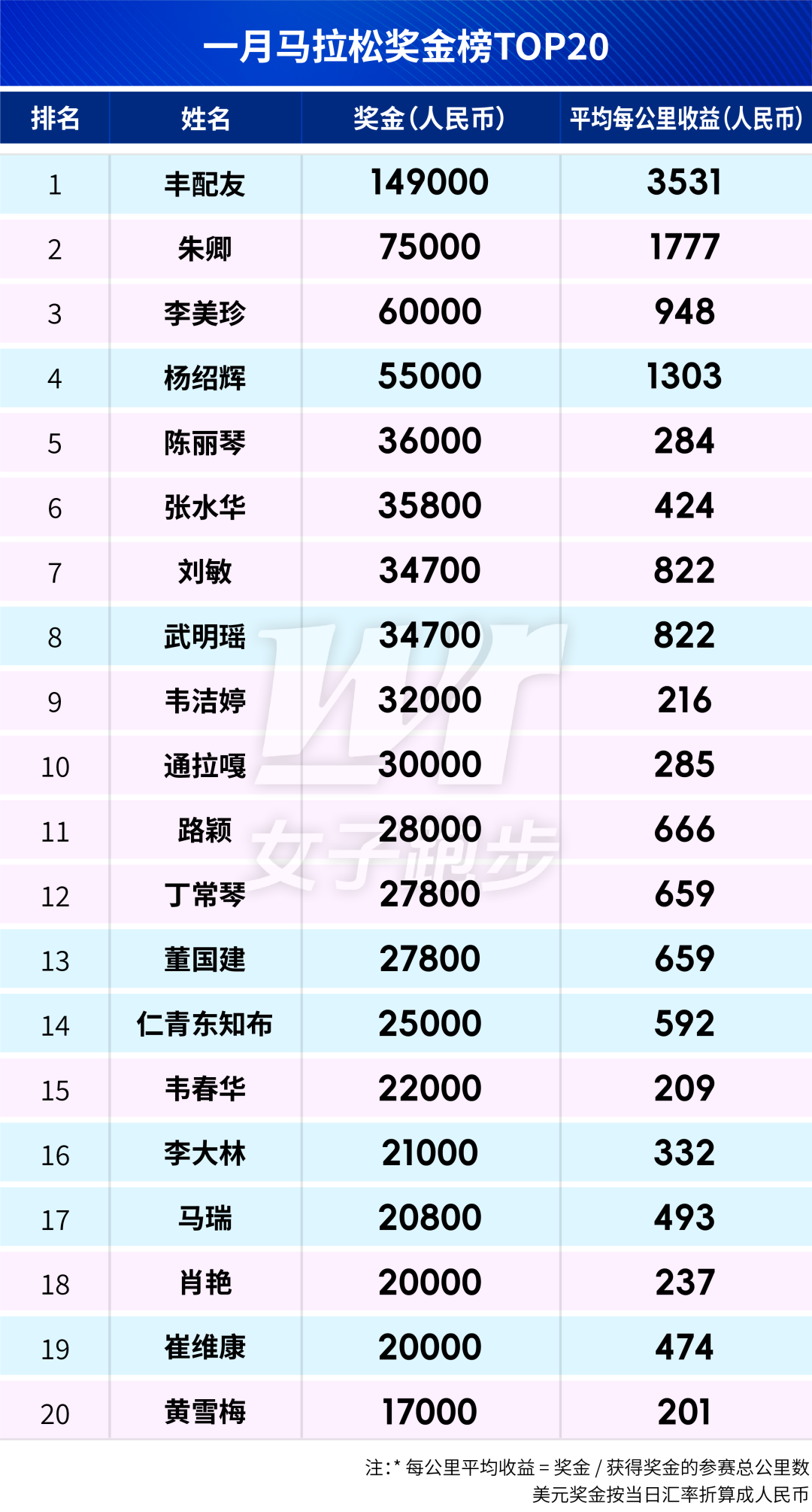 奖金榜计算了每公里平均收益,反映了运动员奖金收益的效率,部分运动员参赛频次虽然低,但是参加大赛并获得较高名次,每公里收益就高,而部分运动员频繁参加小型比赛,平均收益就相对较低。一月女子运动员平均收益最高的是朱卿,她只参加了重马一场比赛,但获得国内女子第一且突破了230,获得了有门槛的(成绩突破230)国内第一7.5万人民币奖金,而不是国际第三的1万美元;男子收益最高的是丰配友,不但获得了国际男子第二,拿走2万美元奖金,而且拿到了破国内赛会纪录的1万人民币奖励,每公里收益达到惊人的3531元。男子榜单上蒋金志在半马中夺冠并打破赛会纪录,获得5000元奖金和1万元破赛会纪录奖励,因此平均每公里收益也较高。