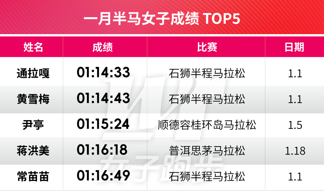 在1月的半马排行榜上,出现了一些亮眼的名字,比如00后的选手通拉嘎在福建石狮半程马拉松上,以最后200米绝杀黄雪梅的方式战胜了对手。虽然114的成绩还不及她的半马PB,但足以送她登上1月半马的NO.1,她在赛后也表示,这是一场足够让她获取自信心的比赛。另一位凭借半马成绩上榜的尹亭,不光半马表现不错,她在今年厦马跑出2:38:18,时隔近两年PB。