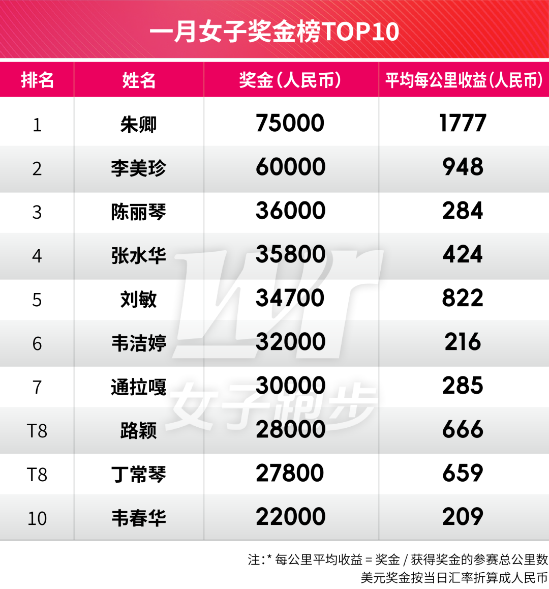 而大众选手关注的黄雪梅,尽管有背靠背从港百到金门半马的连续作战,但本榜单不计算越野赛奖金收入且港百本身也不设奖金(据查,10场世界越野跑大满贯系列赛中有3场不设奖金,港百是其中之一,另外两场是黑峡谷和南唐斯100,但世界越野跑大满贯系列赛设有年终总奖金池),所以这个月参加了石狮半马、厦马、港百和金门半马的她所获奖金为17000元,没能进入一月奖金女子TOP10。